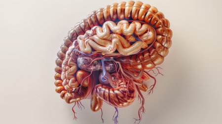A D model of the human digestive system, including the stomach, intestines, and liver, set on a soft background with clear anatomical details