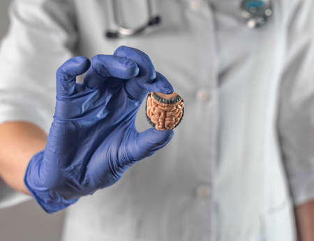 Intestine symbol in hands of female doctor. Intestinal anatomical internal organ.