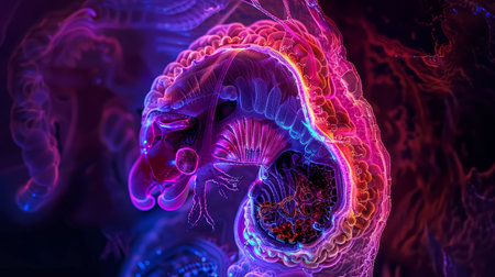 Cross-section of a developing animal embryo under UV light, highlighting the early stages of organ formation