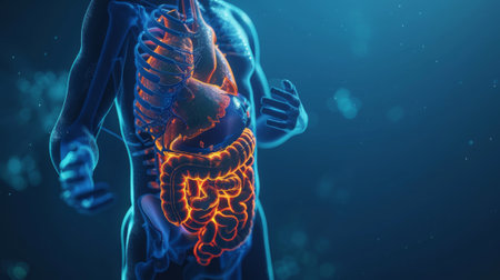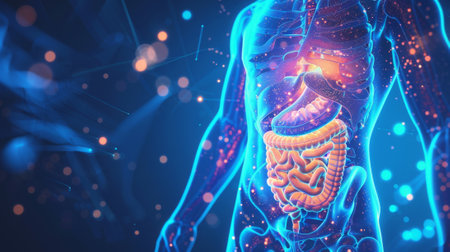 A vibrant image of a human digestive system illustration, showing the entire digestive tract from the mouth to the intestines, with clear, labeled parts.