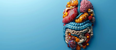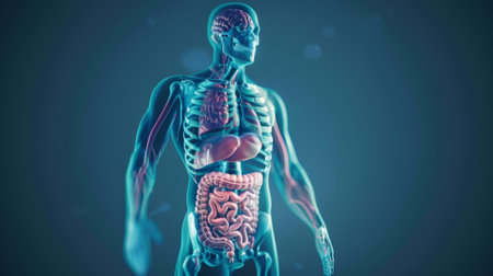 This digital image showcases a detailed representation of various organs within the human body, Different human body systems blended into one image, AI Generated