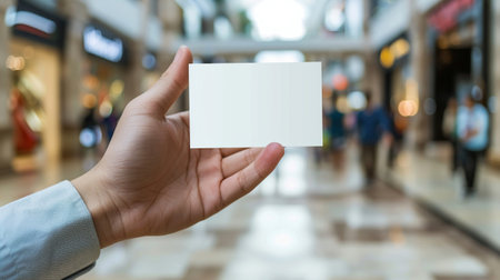 A close-up of a hand presenting a blank business card in a busy shopping mall environment, space for text and advertisement.