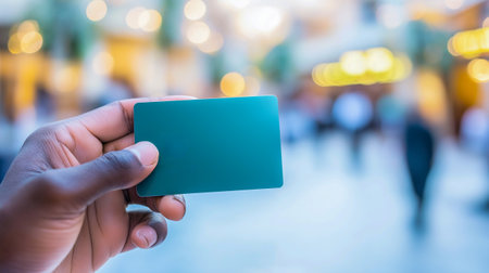 Hand of African American individual displays teal credit card in a lively shopping area, with blurred figures and warm lights creating an inviting ambiance