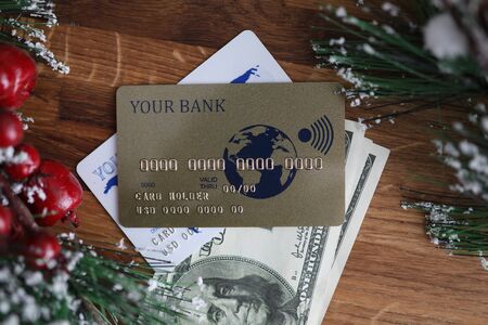 Top view of golden plastic credit card lying on banknotes of one hundred on brown wooden table. Empty space for number and name. New Year gifts concept