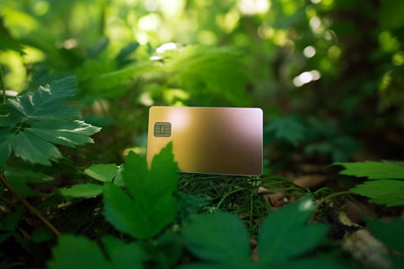 Golden credit card on a background of green leaves. Green Friday, sustainable consumption, sustainability, ecology, zero waste and sale concept. Copy space for text.