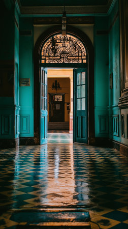A dimly lit corridor stretches ahead, lined with wooden doors and inviting an air of suspense and curiosity during night time.