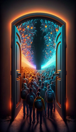A man standing in front of two doors, one modern and bright, the other old and worn, symbolizing choices between innovation and tradition, progress and comfort