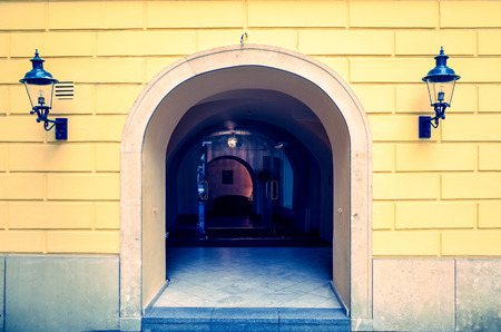 Yellow door of street cafe, stock photo