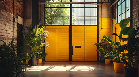 A serene office space featuring vibrant plants and striking yellow doors perfect for inspiration.