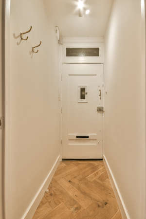 A serene hallway features a smooth polished floor reflecting subtle lighting. The minimalist architecture creates an atmosphere of calm and elegance with its soft hues and clean lines.