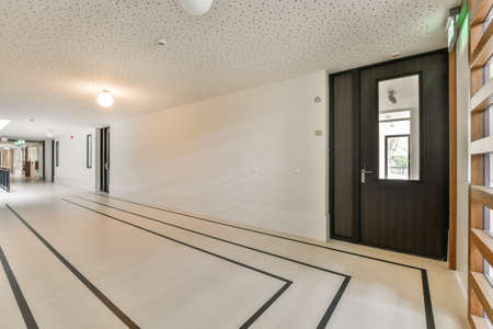 The great long hallway inside the architecture that similar to the hospital with a green tree and the bench that stay on the shiny cleaned floor that reflect a light in the brightest morning. AIGX03.