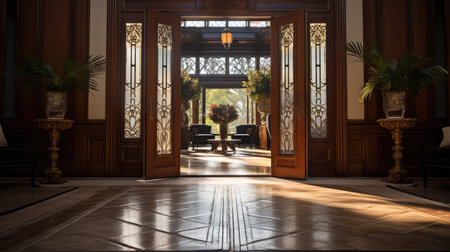 This image showcases the interior of a grand and opulent mansion,featuring a stunning hallway with intricate architectural details,including a magnificent staircase,ornate wood paneling,and a