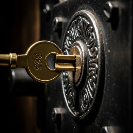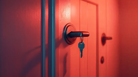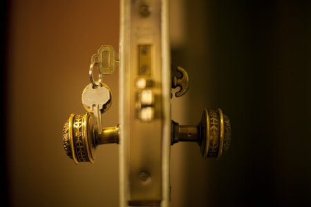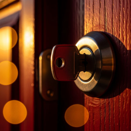 A close view of a door lock and key showcases intricate details in soft lighting, highlighting a sense of security near a family home.