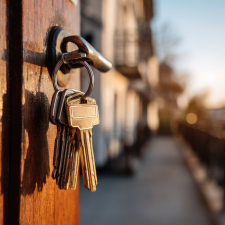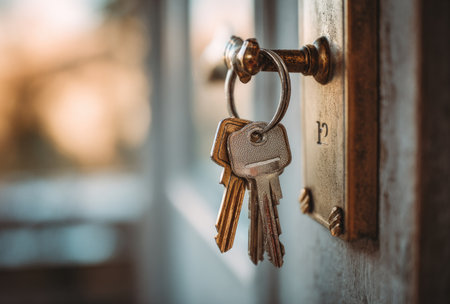 A close-up view presents a set of keys hanging on a brass-colored door handle. The composition showcases the keys in sharp focus, while the background is blurred. The warm color tones and shallow depth of field evoke a sense of home and security, suitable for various editorial and commercial applications.