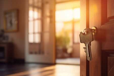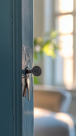 Keys are placed in the lock of a modern door, indicating entry, while a cozy living room is visible in the background, filled with natural light and inviting decor.