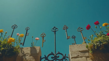 A captivating image showcasing a collection of decorative keys perched above colorful flowers against a bright blue sky. This scene exudes charm and beauty.