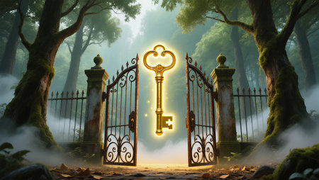Golden key hovers above ornate gates, surrounded by lush greenery and mist.