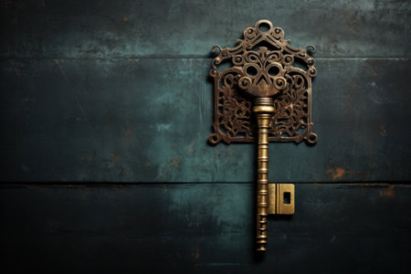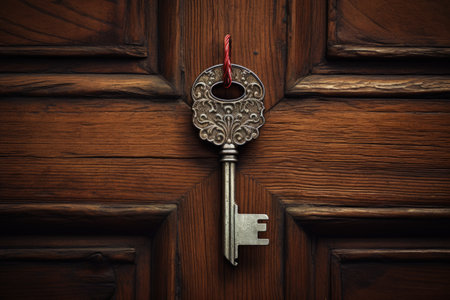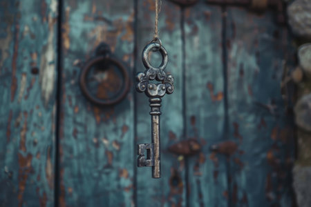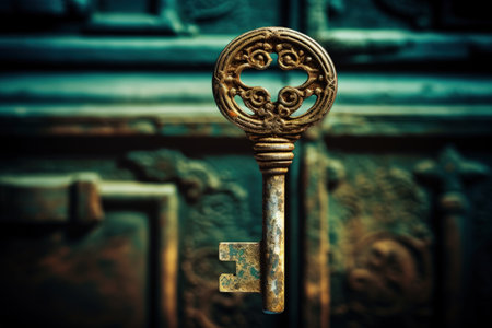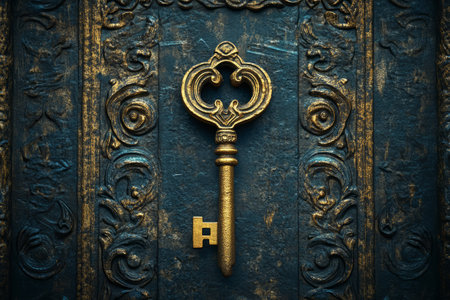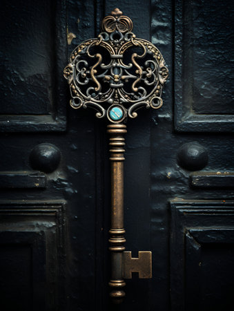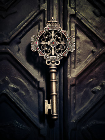 An intricately crafted vintage key poised to open a hidden passage, casting a soft glow that hints at secrets waiting beyond the threshold.