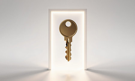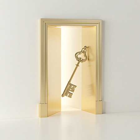 Golden key suspended in midair unlocking a glowing invisible door, minimal gradient background, symbol of opportunity and new beginnings, cinematic