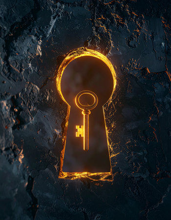A mysterious keyhole glows with a warm, fiery light in a dark stone wall, revealing the silhouette of a key within.