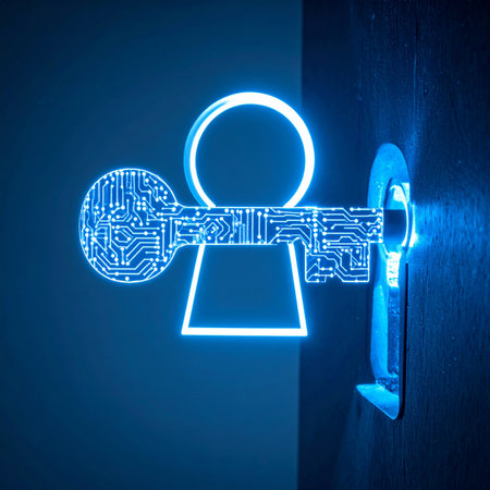 A glowing blue digital key, intricately designed like a circuit board, is about to unlock a keyhole, symbolizing the gateway to data and information.