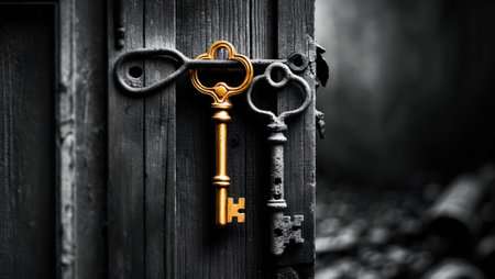 Two ornate keys hang on a rustic wooden door with a mysterious background hinting at hidden secrets