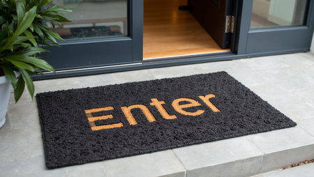 Modern Enter doormat on stone floor in front of sleek door