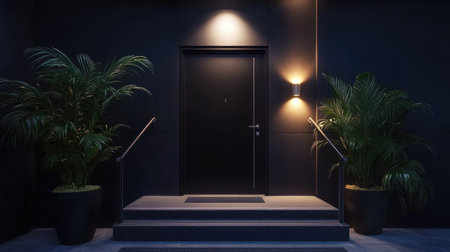 A sleek modern doorway illuminated by soft lights, framed by lush green plants. This inviting entrance evokes a sense of tranquility and elegance.