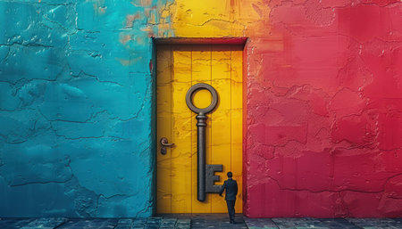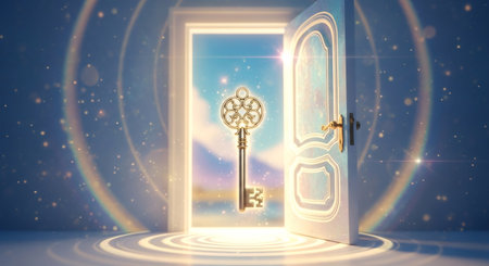An open golden door with an antique key represents access and opportunity with a bright background Perfect for concepts like new beginnings and success.
