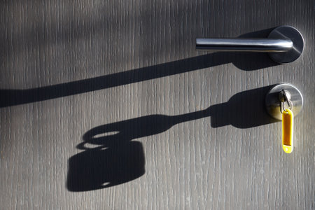 door key with label tag and its silhouette over the door