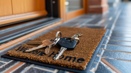 A serene image of keys placed on a welcome mat, reflecting the warmth of home. The scene captures the essence of security and new beginnings in a stylish entryway.