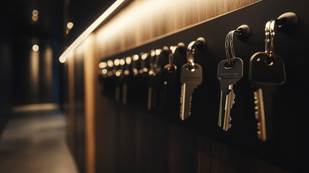 A close-up of a valet parking key storage board with labeled hooks, set against a backdrop of a stylish reception desk in a high-end hotel lobby.