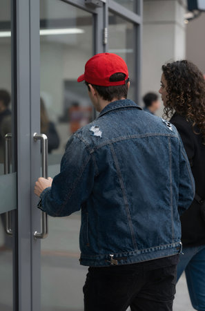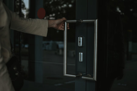 a woman holds the door handle with her hand and tries to go inside the building to work