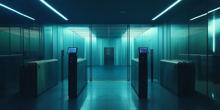 High-security facility entrance with keypad and scanner, copy space