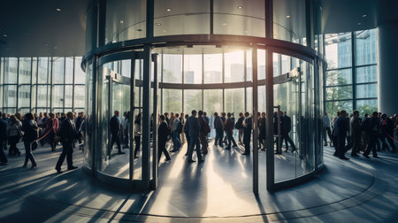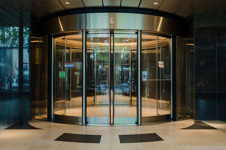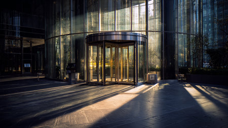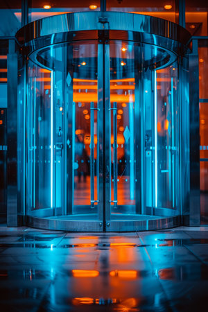Sophisticated glass revolving door illuminated by soft lighting against modern building exterior