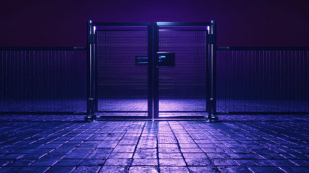 A futuristic open gate illuminated by neon light creates an urban scene against a dark backdrop, accentuating its unique design and textured floor.