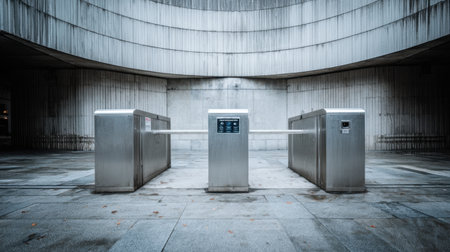 A sleek turnstile installation stands prominently in an urban environment, surrounded by expansive gray concrete, showcasing a modern minimalist design ideal for transportation settings.