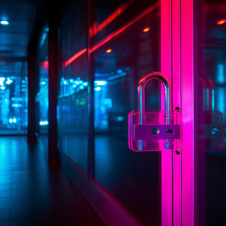 A glowing neon security sign illuminates a dark corridor creating a moody atmosphere