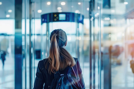 Rear view of a traveler with a backpack facing automatic security doors at the airport. A.I.