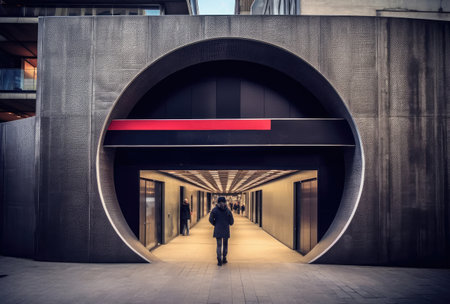 Captivating modern building entrance surrounded by orange lights, emphasizing sleek architecture. The night scene combines technology and art in an urban environment.