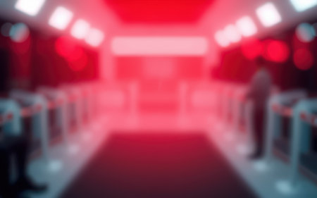 Red-lit futuristic train station with passengers waiting for departure during nighttime