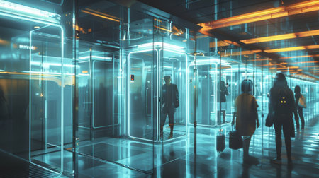 A group of people are walking through a large, brightly lit room. futuristic technology