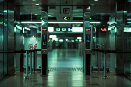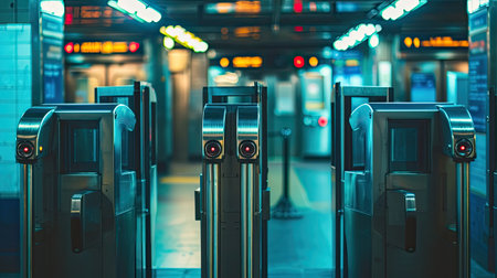 subway system with a photograph of turnstiles at the entrance of an empty station, providing blank space for design or advertising purposes, with a focus on the distinct character of each turnstile
