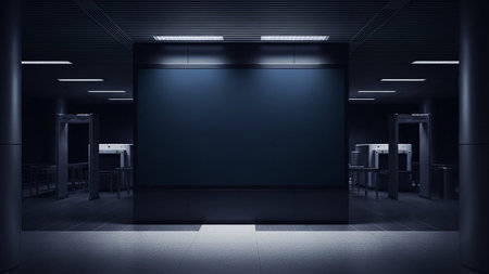 A dimly lit, modern airport security checkpoint a large, blank dark blue digital screen as the central focus. The scene is characterized by its dark, cool color palette and minimalist Overhead fluorescent lights cast long shadows on the tiled floor, and metal detectors stand on either side, hinting at the function of the space. The overall atmosphere is one of quiet anticipation and technological advancement.