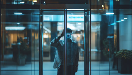 Man unlocks glass office door using facial recognition technology in modern workplace setting
