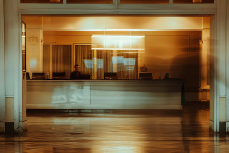 Sophisticated office building entrance featuring open glass doors and inviting ambient lighting