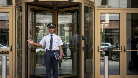 Friendly doorman welcoming guests at modern city hotel entrance.
