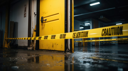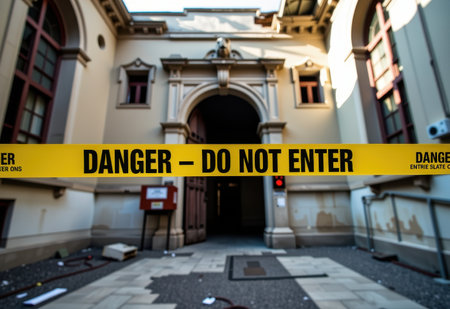 A close-up of a yellow caution tape reading DANGER - DO NOT ENTER stretched across the entrance of an abandoned, decaying building.