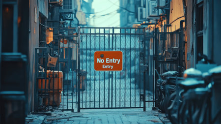 A captivating image of a wrought iron gate with a prominent No Entry sign, nestled in a narrow alleyway, evoking a sense of urban isolation and mystery.