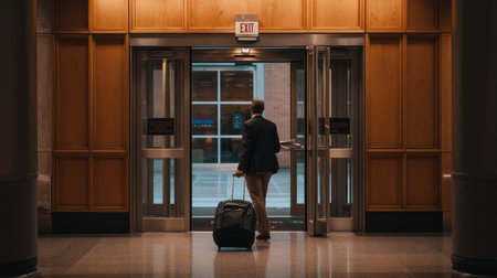 A man is walking out of a building with a suitcase. The building has a red exit sign